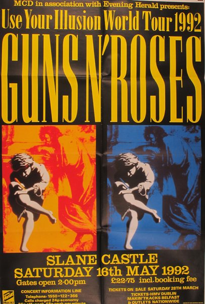16 de mayo de 1992. Los Guns N' Roses, hacen su presentacion en el Slane Castle, Dublin. U2 envía una caja de whiskey irlandes de 40 años y un barril de Guinness para la banda. My Little Funhouse abre el show seguidos por Faith No More.